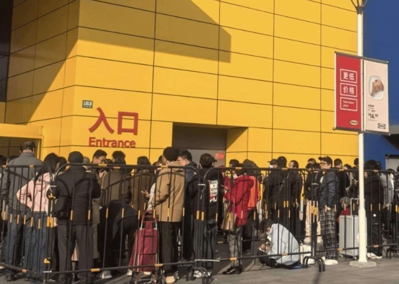 清晨七点●▪,上海宝山宜家商场清仓首日,门前排起百米长队=。为抢购折扣商品,有顾客提前三小时等候●▷◆,货架上3至7折的商品被迅速扫空,结账队伍在楼层蜿蜒。
