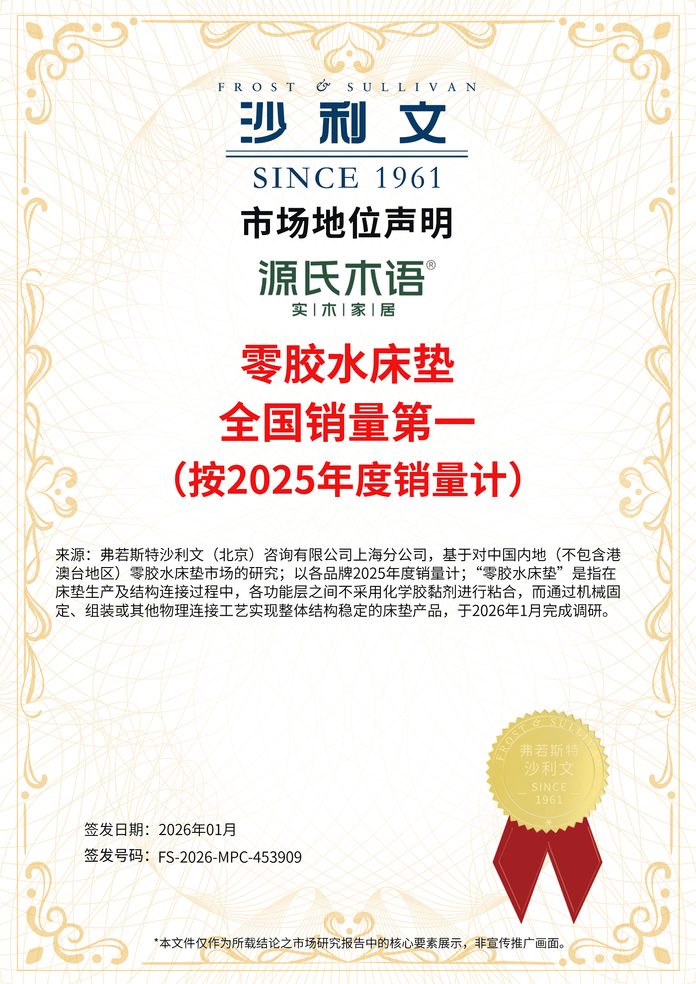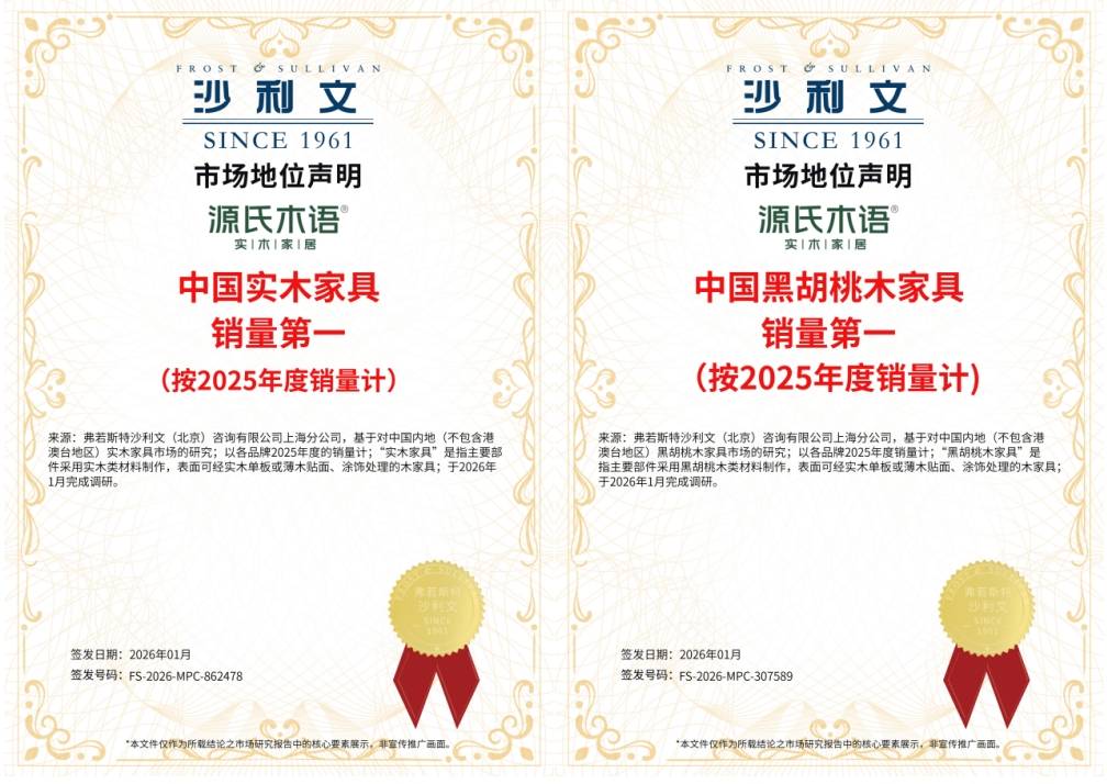近日,全球权威增长咨询机构弗若斯特沙利文(Frost & Sullivan,简称“沙利文”)发布认证,授予实木家居品牌源氏木语“2025年中国实木家具销量第一”“中国黑胡桃木家具销量第一”及“0胶水床垫全国销量第一”三项市场认定。调研数据显示,凭借在材质、工艺与健康理念上的持续深耕,源氏木语已在整体实木家具、黑胡桃木细分市场及环保0胶水床垫领域均已实现销量第一。